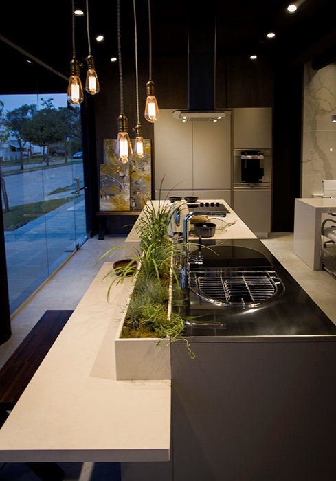La configuración de la propuesta conjuga grandes ingresos de luz natural con la oscuridad de los materiales en la dosis perfecta para generar un sentimiento de querer permanecer y disfrutar tanto sea de la íntima experiencia de cocinar para pocos o la enriquecedora capacidad de compartir.