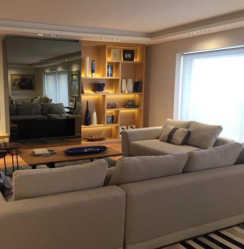 El living comedor se divide en living propiamente dicho con rinconero para relax, reuniones y zona de plasma. En un lateral hay un mueble con luz que destaca los objetos y obras de arte que se ubican en el mismo. Dos sillones de ratán completan el living junto a varias mesas bajas.
