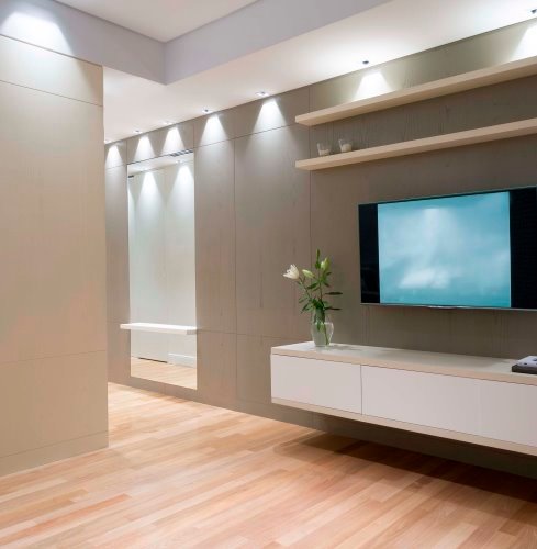 Dentro de la obra priman materiales como el cristal y la madera laqueada blanca. Se incorporó tambien un novedoso sistema llamado Wall Unit, que permite ocultar cables, una herramienta para conservar el aspecto puro de los espacios interiores.
