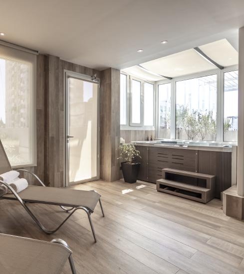 La esencia del espacio está conformada por texturas, filtros espaciales y lumínicos, privilegiando la naturaleza que entra por los amplios ventanales y se elige para ser parte fundamental del contacto con las áreas descubiertas de pool bar, vistas a las canchas de tenis.