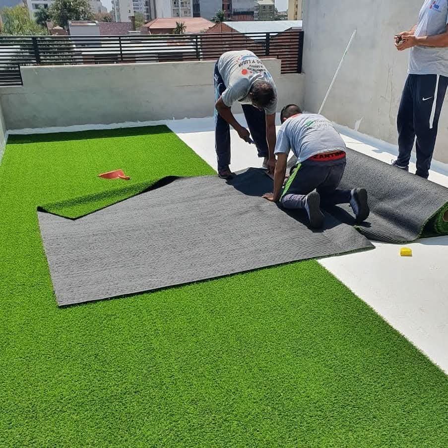 Con respecto al césped sintético, se instala sobre la losa el césped, se pegan las juntas, se agrega arena de sílice y se cepilla para distribuirla.