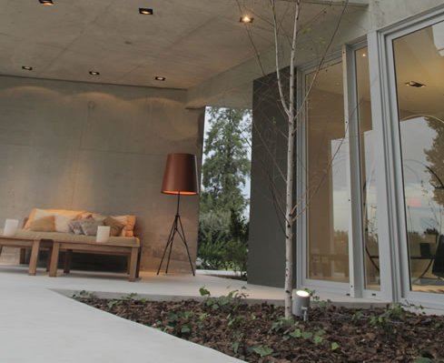 Para generar un efecto especial en el interior la firma ideó potenciar la presencia de los cielorrasos: «Se buscó un efecto dramático, la estrategia fue utilizar embutidos redondos de bafle profundo con dicroled, en el estar para hacer todavía más dramático el resultado y distinguir el espacio arquitectónico, se colocaron embutidos cuadrados con lámpara del tipo AR111 de LED de ángulo cerrado.» concluyen.