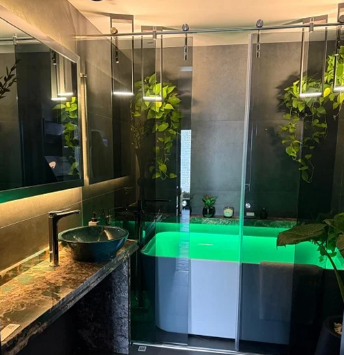 Acqua Door: Esta puerta de baño fusiona funcionalidad, estilo y luminosidad en un solo elemento. Fabricada con cristal templado y herrajes de acero inoxidable, transforma cualquier espacio en un rincón de elegancia y amplitud. Su diseño único maximiza la luminosidad, creando una sensación de espacio abierto y conectado.
