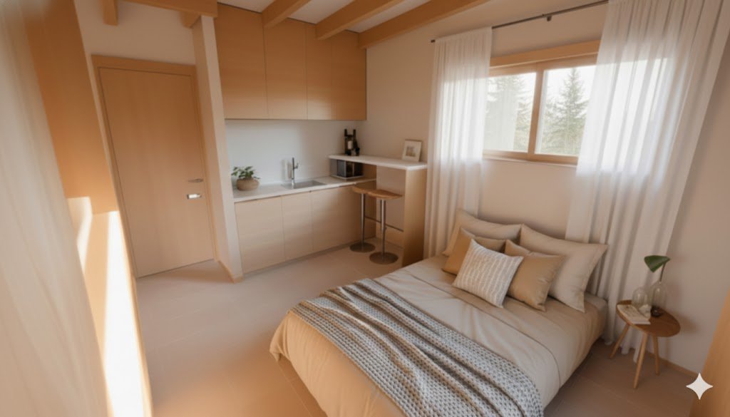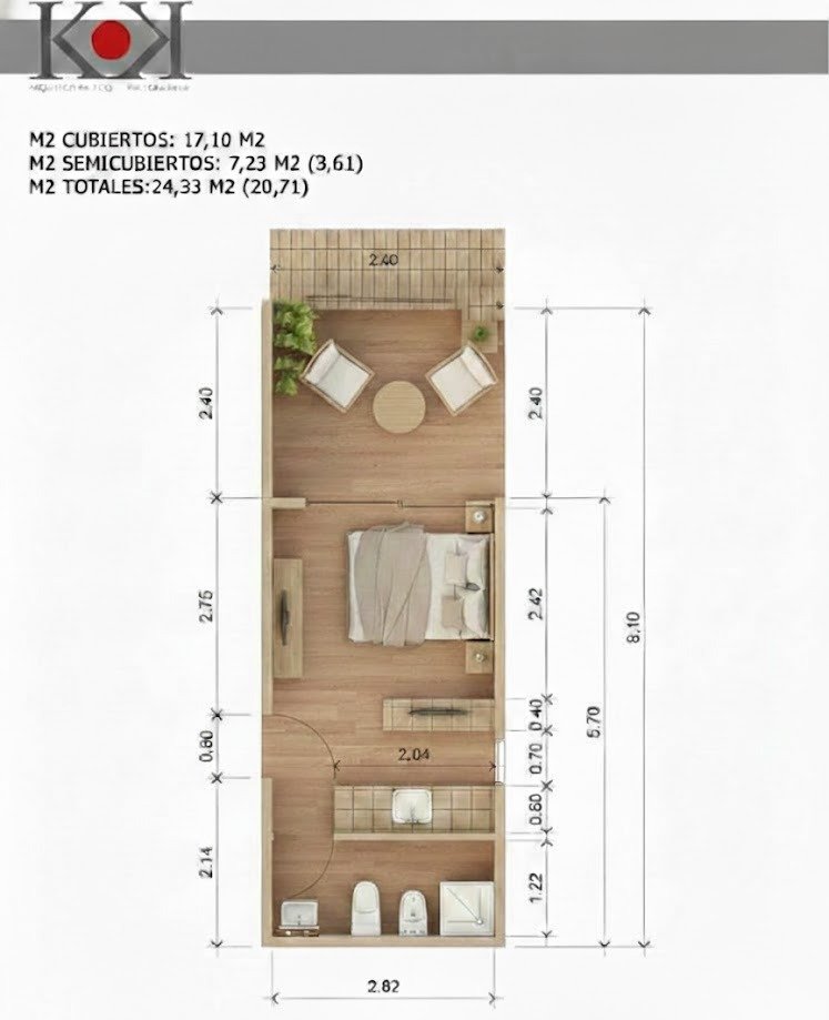 El proyecto de este monoambiente sustentable utiliza madera reforestada proveniente de la provincia e incorpora tecnología aplicada en Misiones mediante el sistema Wood Frank, lo que lo convierte en una opción ideal tanto para primera vivienda como para emprendimientos turísticos por su diseño moderno, práctico y eficiente.