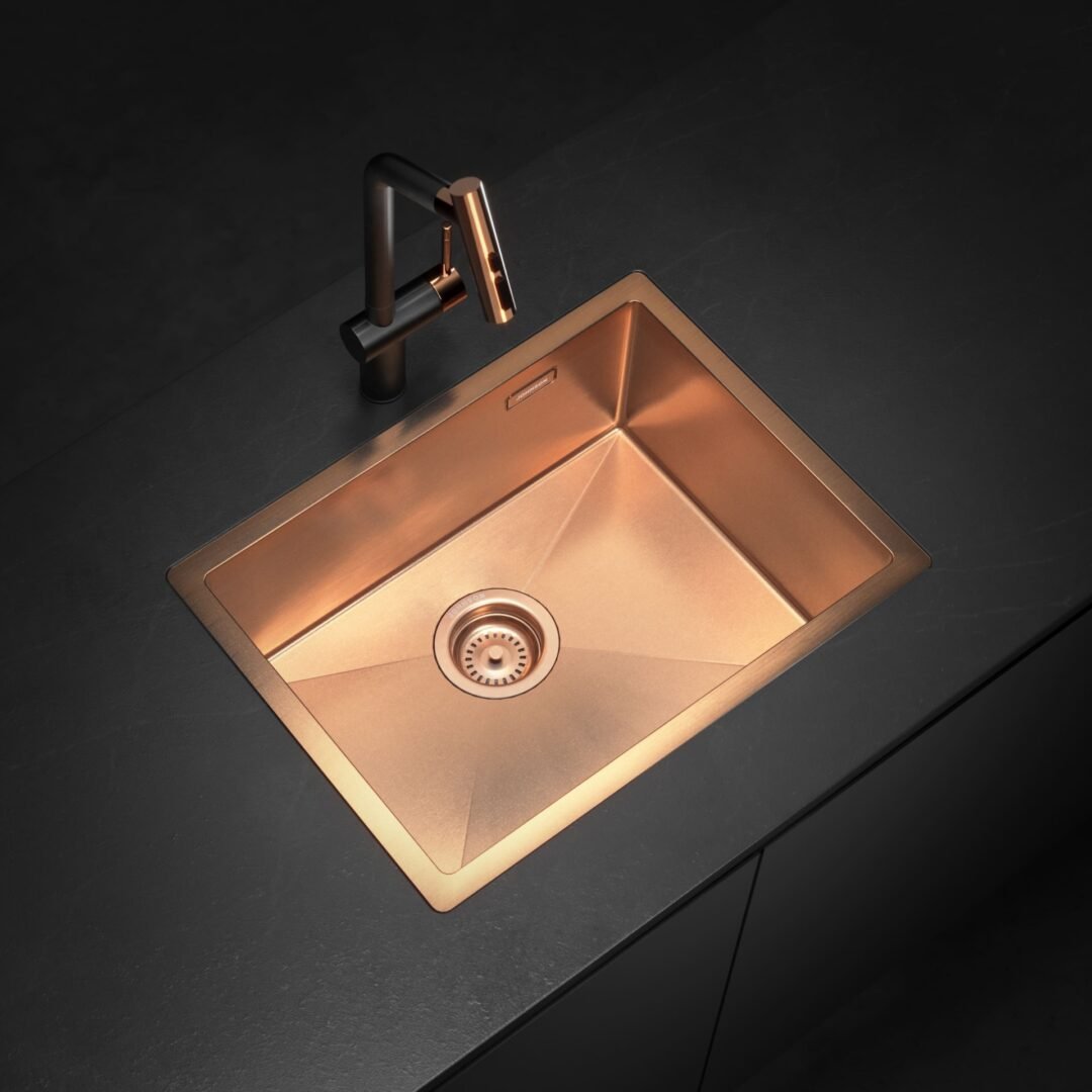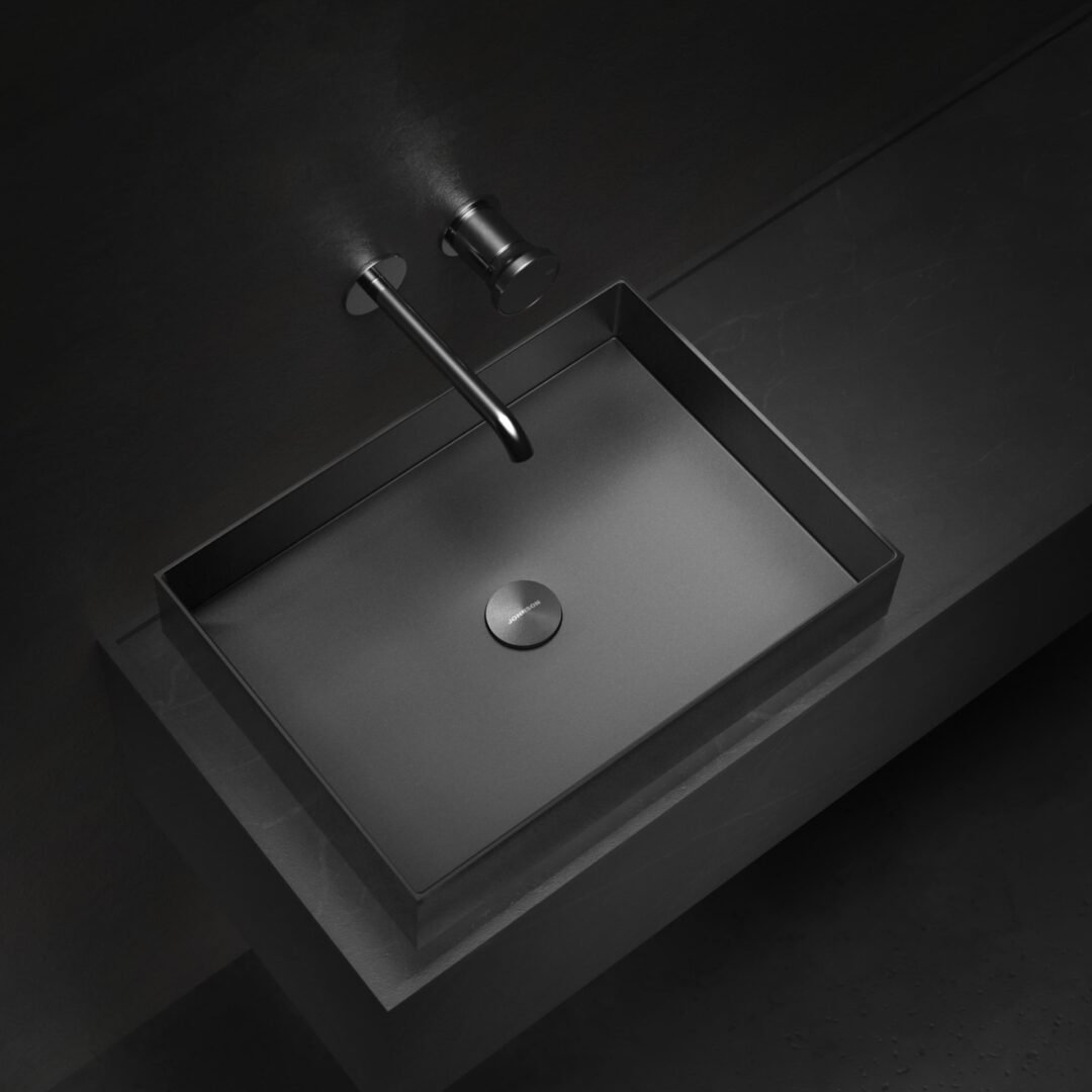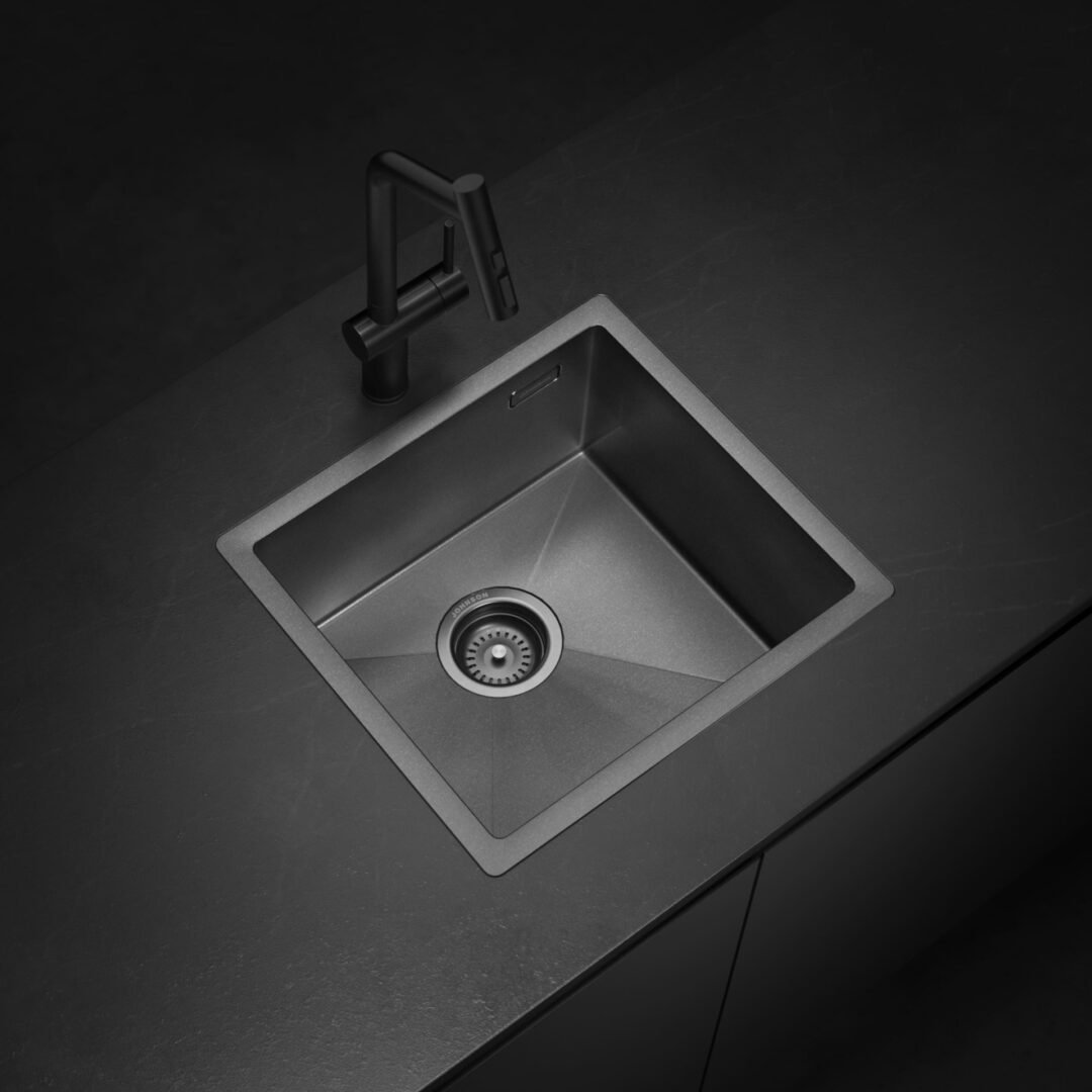 La familia de piletas de acero se expande también hacia nuevas expresiones formales. Aura y Axis proponen dos miradas complementarias: Aura, de geometría circular y terminación Rose Gold Nano PVD, aporta una estética orgánica y envolvente, mientras que Axis, de trazo rectangular y terminación Gun Black Nano PVD, expresa un lenguaje más gráfico y arquitectónico.