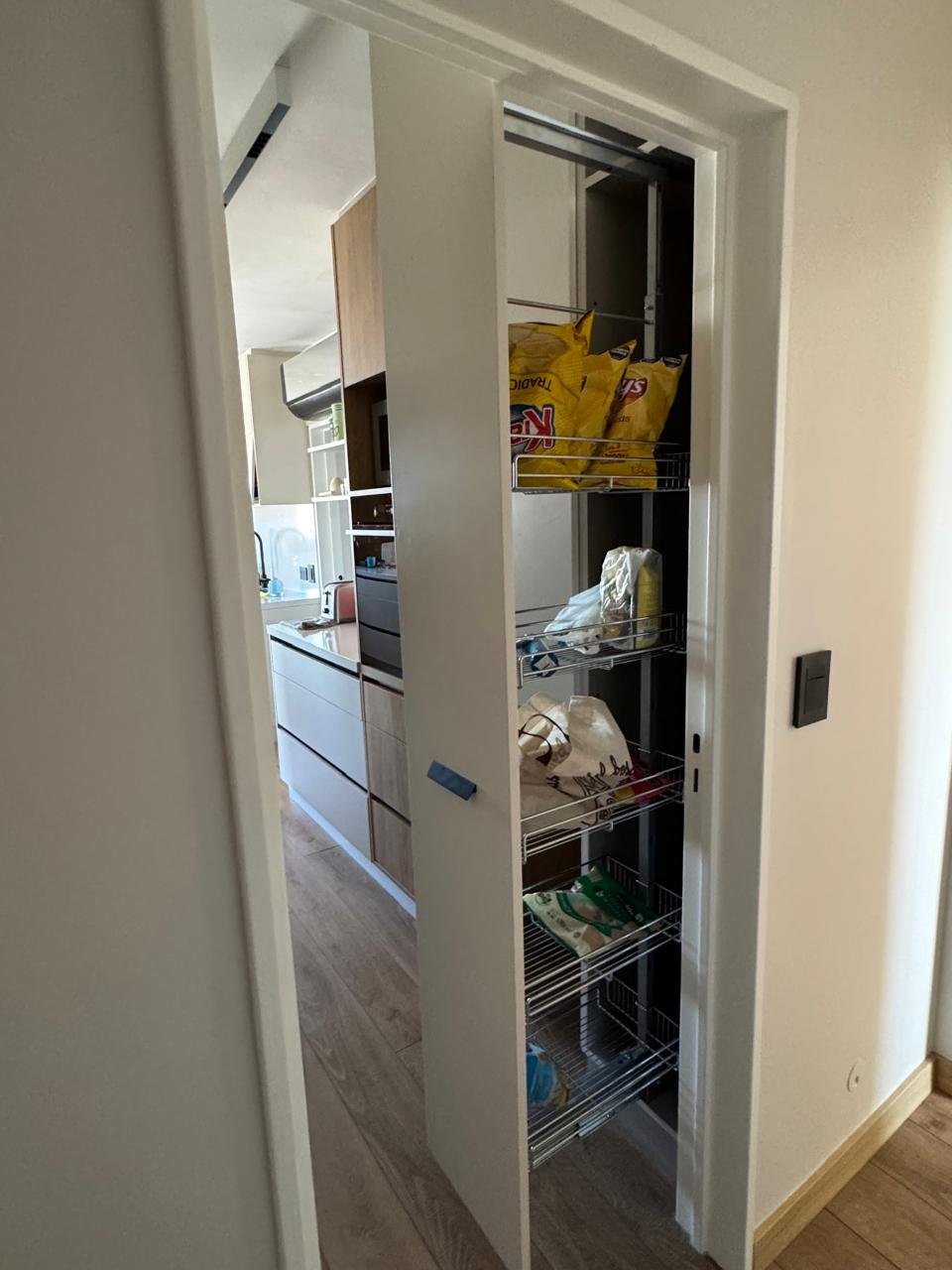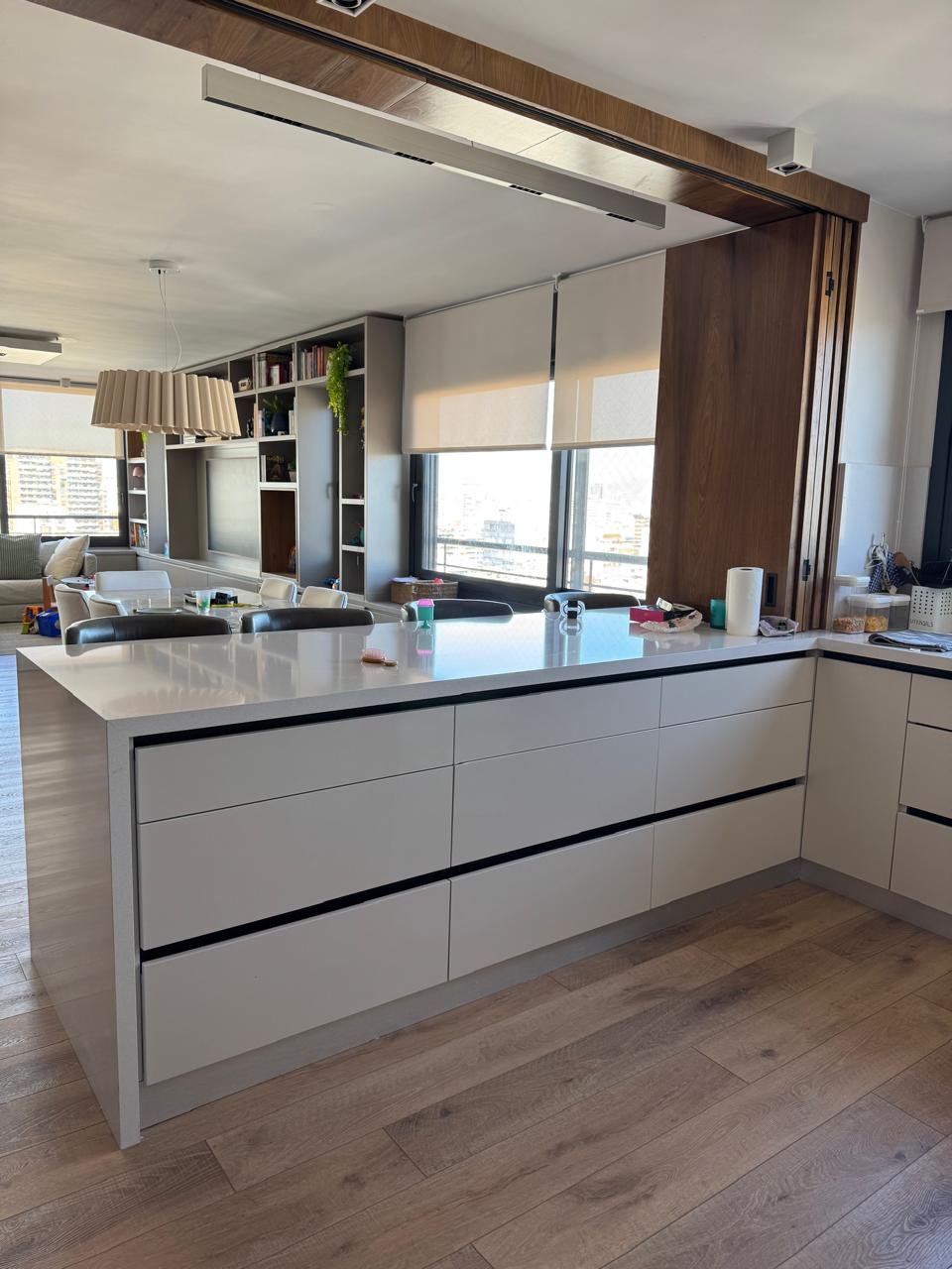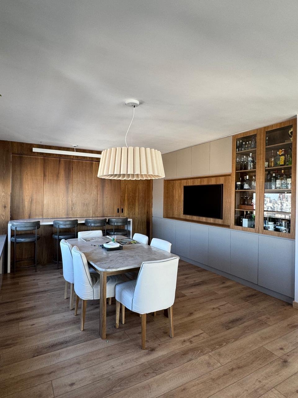 Además, se diseñó una biblioteca totalmente laqueada, la cual logra unidad con todo el espacio rediseñado y, a su vez, continúa con el diseño de la cocina. Asimismo, se incorporó un cerramiento que divide la cocina del living, manteniendo el color natural del de la madera Petiribí y otorgando mayor calidez al espacio.