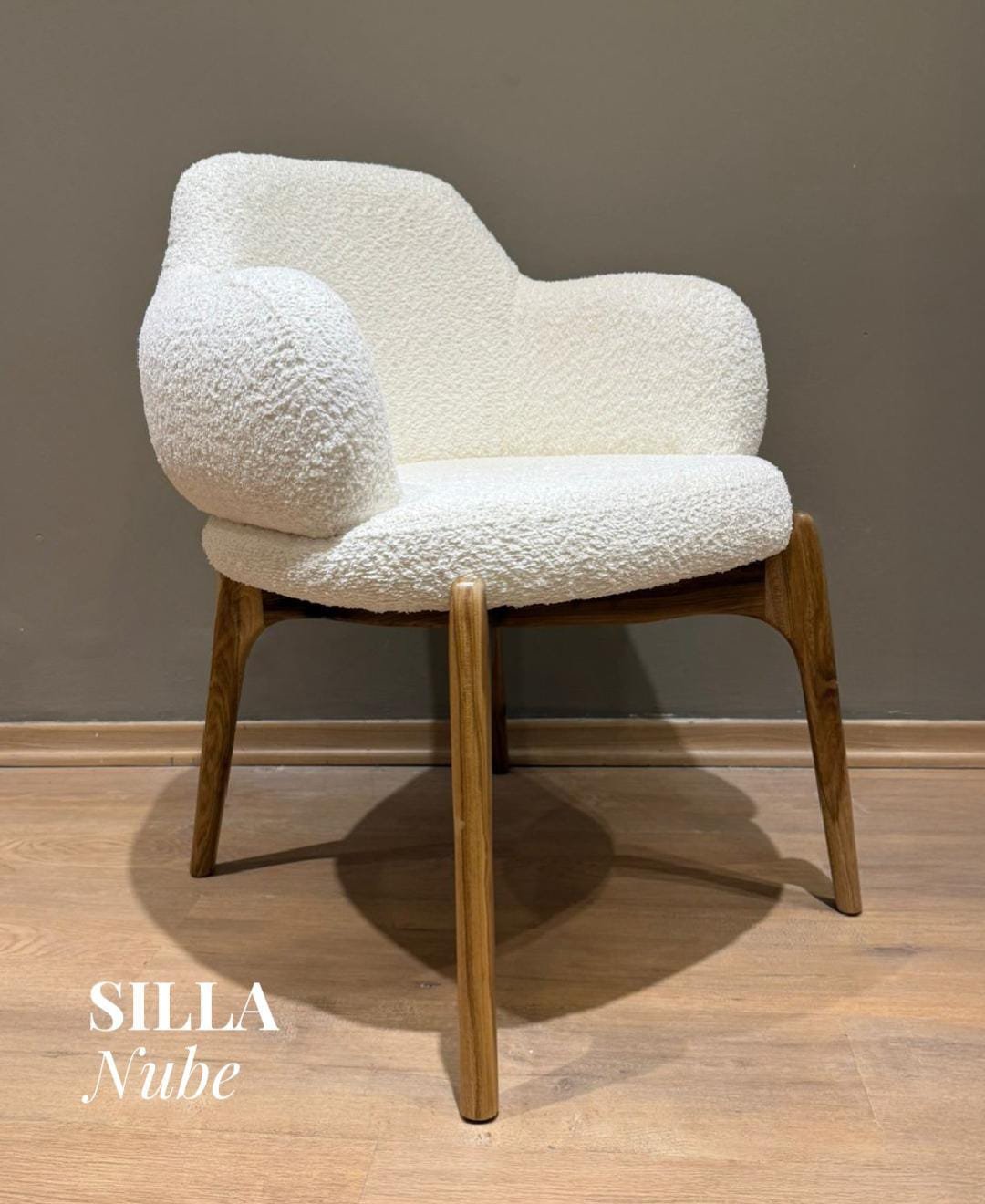 Las sillas de comedor Nube cuentan con tapizado en bouclé y apoyabrazos curvos, la Silla Nube destaca por su comodidad y diseño envolvente. Su base en madera maciza con patas en “X” aporta solidez y un detalle distintivo. Es un modelo versátil que suma elegancia a cualquier espacio.